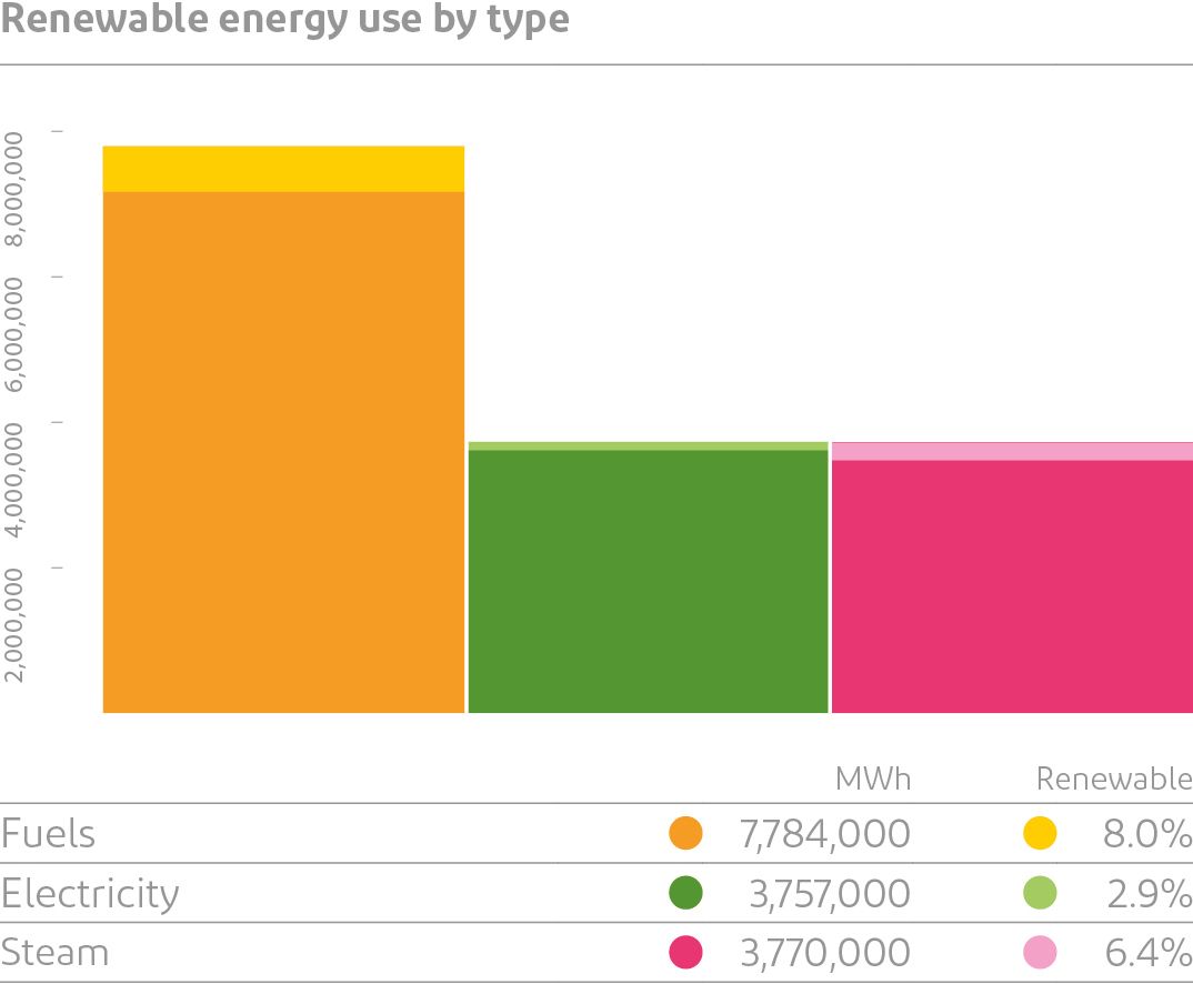 The primary mechanism for reducing our energy use is the Bold Energy Plan, a program we launched in 2008 to improve energy efficiency and reduce greenhouse gas emissions at our global facilities. In 2019, we completed 66 energy savings projects with a savings potential of about 14,200 MTCO2e for the year. Our Procurement, Sustainability, Engineering and EHS teams are also currently working to develop a global renewable energy strategy that will make a significant impact on our operational footprint.