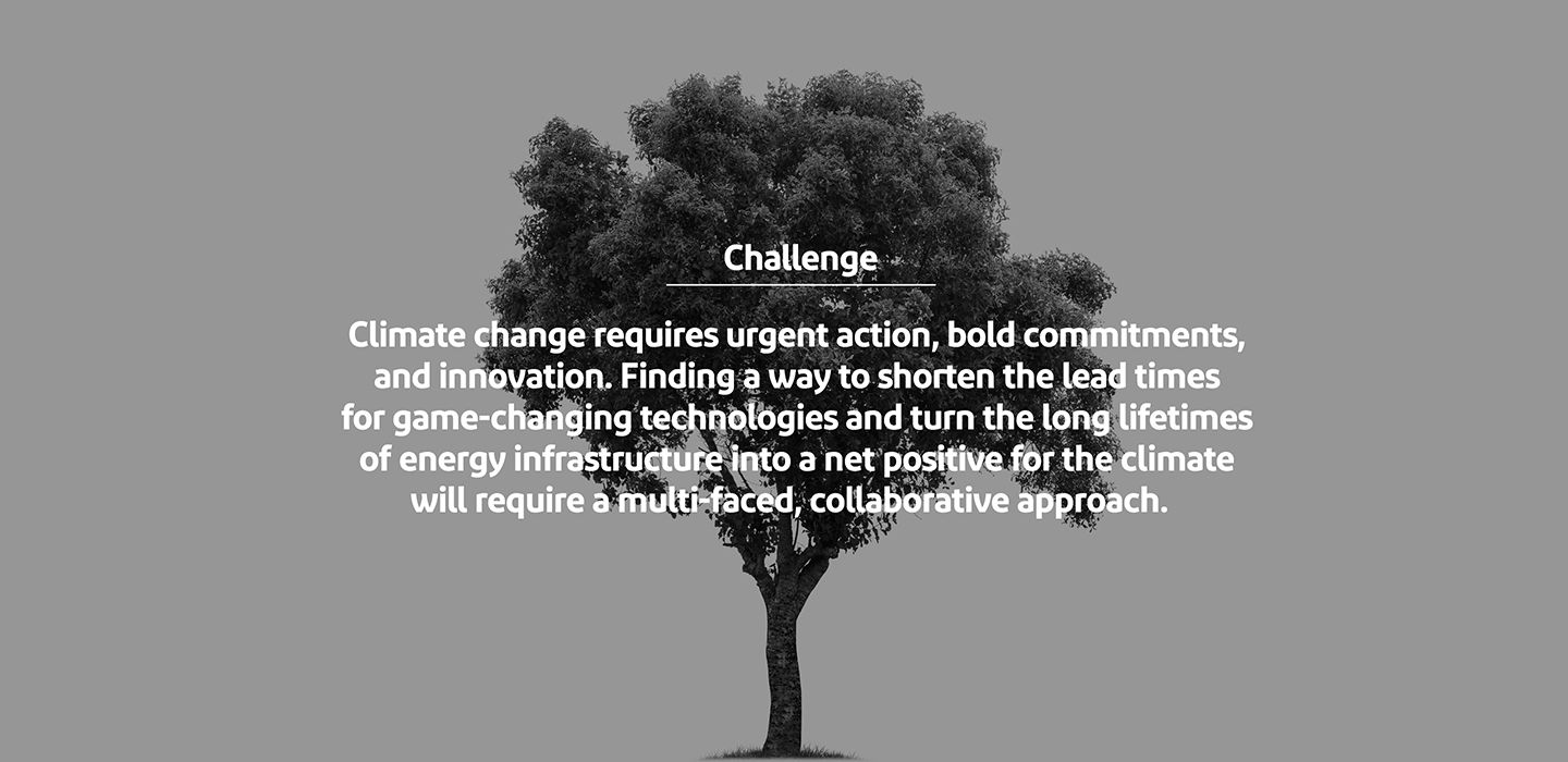 Challenge: Climate change requires urgent action, bold commitments, and innovation. Finding a way to shorten the lead times for game-changing technologies and turn the long lifetimes of energy infrastructure into a net positive for the climate will require a multi-faced, collaborative approach.
