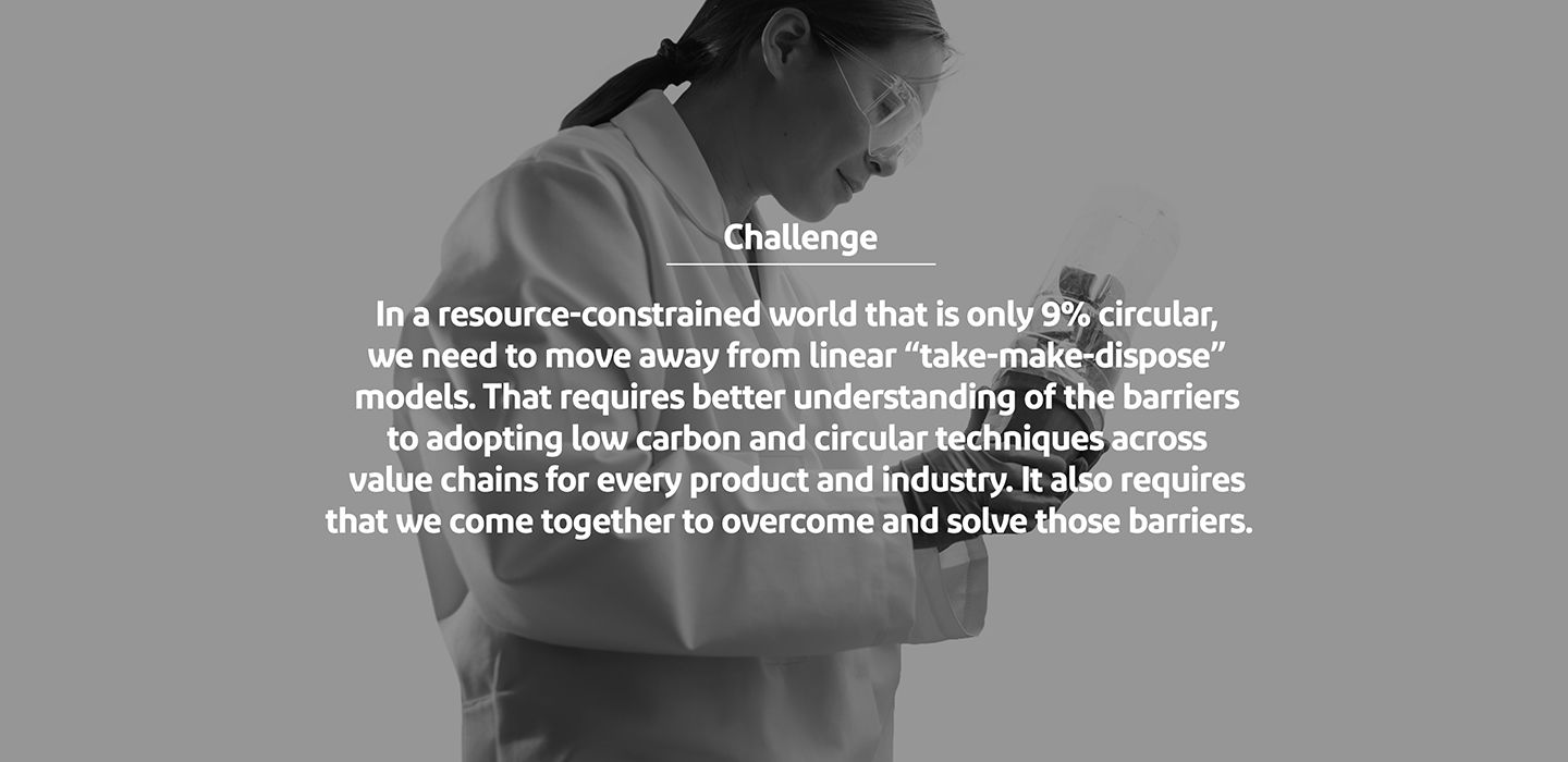 Challenge: In a resource-constrained world that is only 9% circular, we need to move away from linear “take-make-dispose” models. That requires better understanding of the barriers to adopting low carbon and circular techniques across value chains for every product and industry. It also requires that we come together to overcome and solve for those barriers.