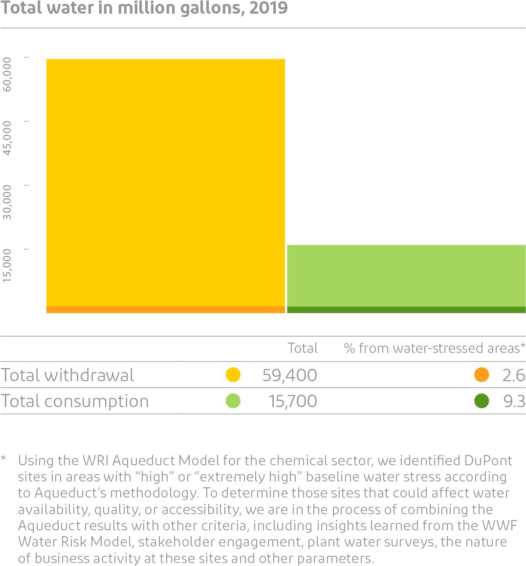 We withdraw and purchase water from various local sources and entities for the purposes of conducting business. Some of that water is treated and returned to a local waterbody, some is rendered in our manufacturing processes, or used for other purposes such as employee health and hygiene. In 2019, we began to examine our new global footprint to understand where and how DuPont de Nemours operations interact with local watersheds.