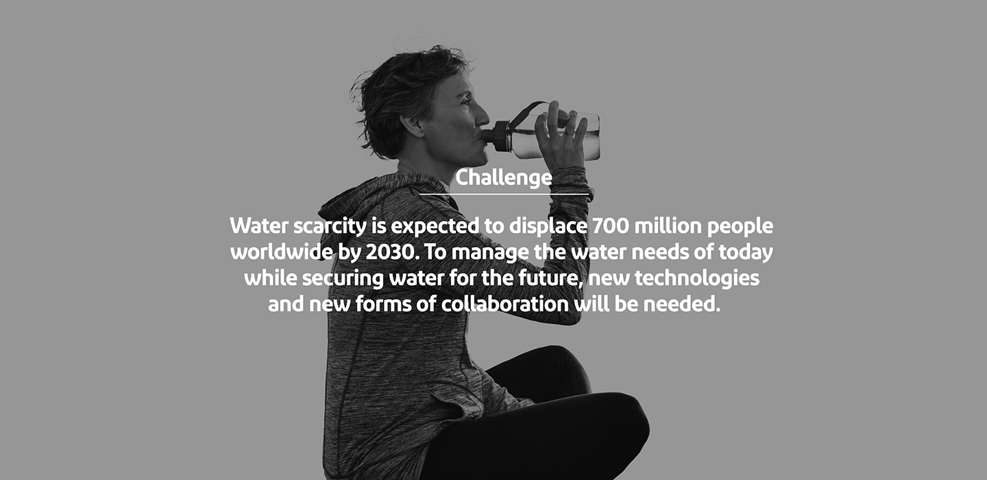 Challenge: Water scarcity is expected to displace 700 million people worldwide by 2030. To manage the water needs of today while securing water for the future, new technologies and new forms of collaboration will be needed.