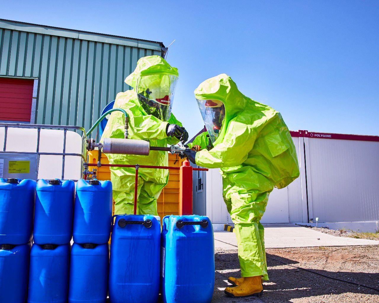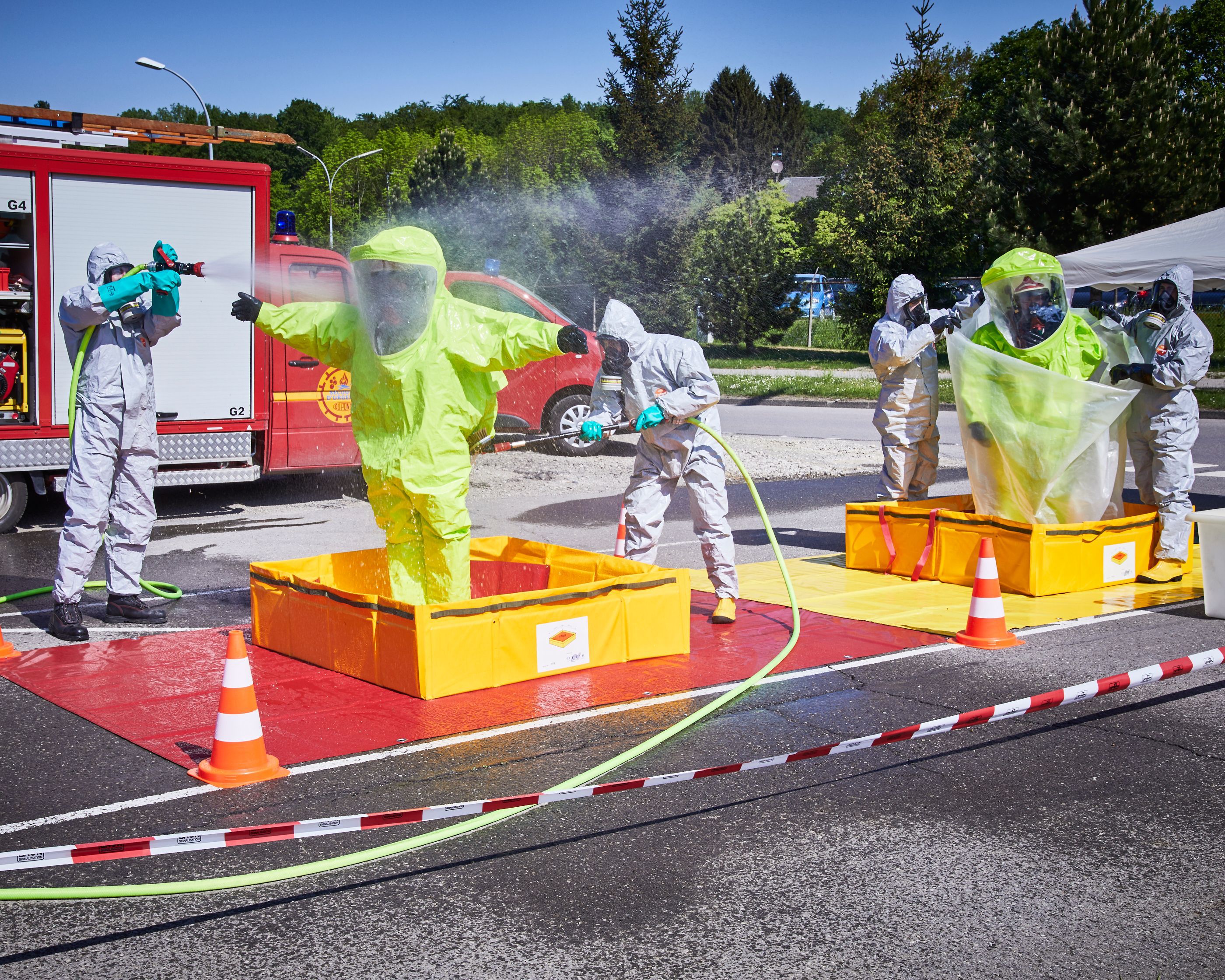 Une fois la fuite réparée, l’équipe de secours suit minutieusement une procédure de décontamination. Protégé par une combinaison Tychem® 6000 F Plus et un masque à filtre, un pompier de la brigade procède à la décontamination de la combinaison Tychem® TK sur l’un des intervenants à l’aide d’un jet d’eau contenant un produit décontaminant.